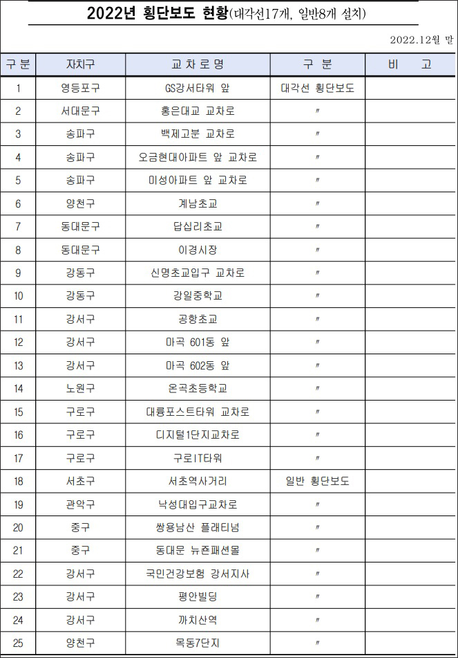 서울시 ’22만년 25횡단보도 설치 및 열기’23거리의 횡단보도 20앞으로도 여러 부지를 추가로 확충하는 등 시민의 편리하고 안전한 보행환경 조성을 위해 지속적으로 추진하겠습니다..