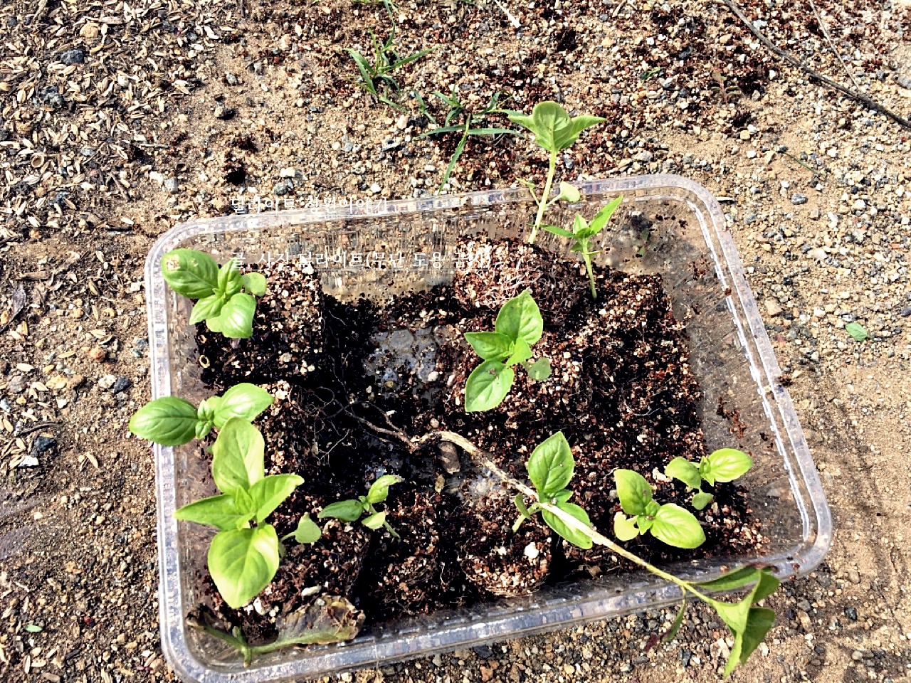 올해의 첫 번째 바질 수확 줄기를 잘라내어 씨앗과 함께 종이컵에 담았습니다. 저번에 바질 잎을 먼저 수확해서 줄기를 잘라줬어요.