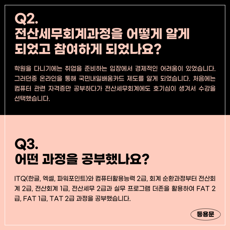 A. 취업 준비에 재정적 어려움으로 대학에 다니고 있습니다. 그러던 중 인터넷으로 전국내일학습카드 제도에 대해 알게 되었다. 처음에는 컴퓨터 관련 자격증만 공부했는데 전산화된 세무회계 과정도 궁금해서 이 과정을 선택하게 되었습니다. Q. 어떤 과정을 공부하셨나요?