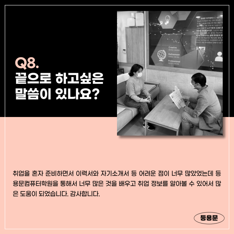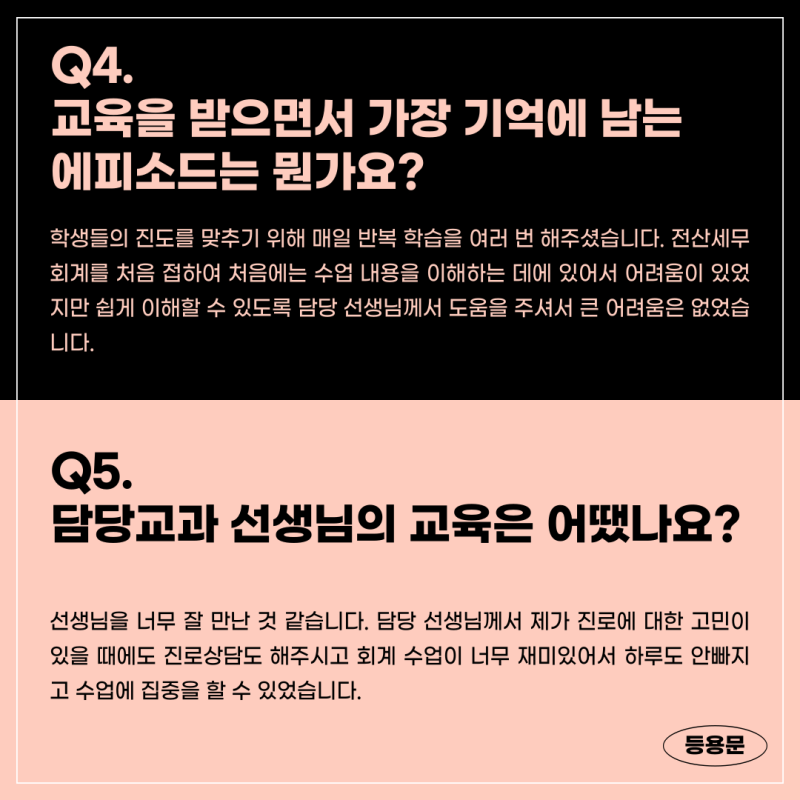 대학 피아노과 졸업 후 피아노 관련 일을 하다가 이직을 위해 ITQ(한국어, 엑셀, 파워포인트) + 컴퓨터지식 2급 과정과 정부지원 세무회계전산과정 연구소 등용문을 수강하였습니다. 전주회계대학 전산회계학과 2. 인터뷰 주인공!