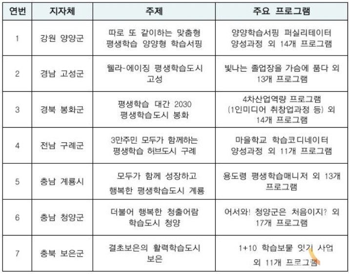 신규 지정 7개 도시 및 기존 지역 지원 특성화 총 24개 평생학습도시 17개 도시 지원, 평생학습 사업 운영비 약 11억원 지원 도시 내 다양한 ​​지방자치단체(지자체, 대학 등)의 참여 유도 및 지방 수준 지원
