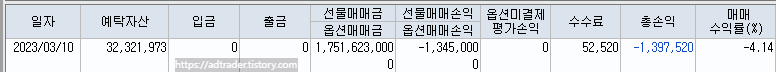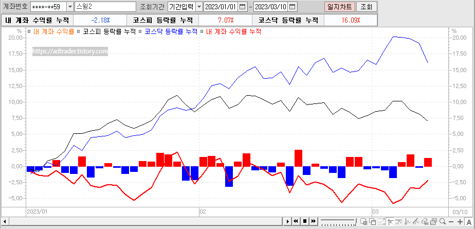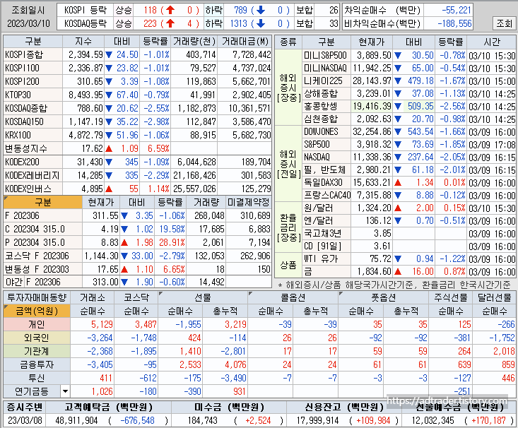 2023년 3월 10일 매매일지 2023년 03월 10일 by issue 1. 시장 상황 시장 합성 투자자별 거래동향 2. 스윙 1 수율 비교표 '추천 관련글, 자동차세 연납 신청기간(연납할인율?)생방송 투데이 우대 칼비 스테이크 리얼 음식 장소코로나 대중교통 마스크 제거2023년 고교교육 기여대학 지원사업 판매하지 않습니다. 3. 스윙 2 수율 비교표 혜택 실현 손익 4. 국내 파생상품 일일손익