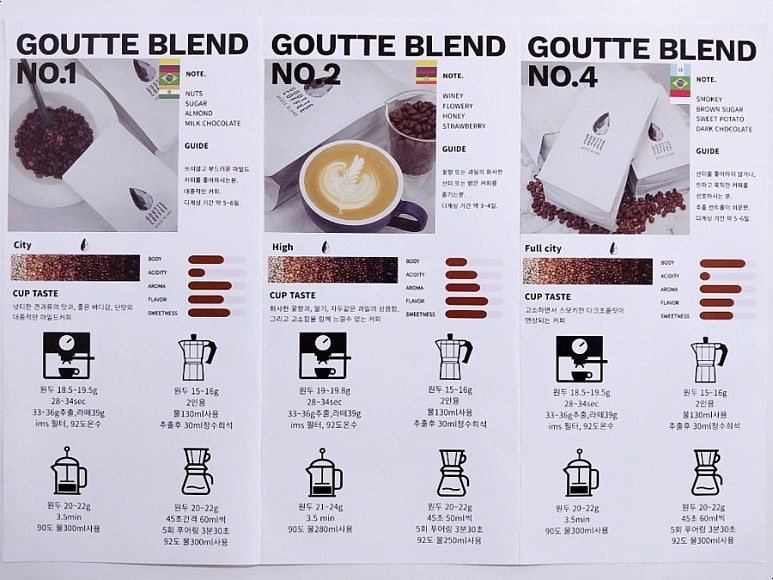 서비스로 주신 드립백 커피가 얼마나 소소한 기쁨이었는지…! 센스있는 판매자! Gutte는 프랑스어로 물방울, 아주 적은 양의 액체라는 뜻인데 커피 한 방울도 맛있게 먹을 수 있다는 뜻인 것 같아요! 구떼커피의 시그니처 로고는 완벽한 다이아몬드 드롭 형태! 안에서 스페셜티 커피를 만나 코스타리카산 몬타냐와 콜롬비아산 라수이사 두 종류를 맛보았어요! 홈카페 커피만드는법 외에도 거트블렌드도 소개해주셔서 다음엔 블렌드도 해보고싶고 오늘은 콜롬비아 라수이사를 먼저 먹어볼게요! 구떼커피는 최고급 고급 로스터를 사용하여 스페셜티 등급의 커피를 로스팅합니다! 기대하고 있습니다. 순한 스타일의 콜롬비아 라수이사를 먹어보려 합니다. 잡티도 없고 못생긴 아이들도 없고 색깔도 고르게 구워져 신선하면서도 기름지지 않아요! 그라인더로 갈아도 되지만 기계로 갈아준 후에는 손으로 갈기 귀찮으니 그냥 부어주세요! 향긋한 커피향이 퍼지는 홈카페의 장점. . . 방안을 가득 채우는 커피향이 좋아요. 신선도 때문인지 거품이 많이 나왔다. 아이스 아메리카노와 함께 마십니다. 자몽의 상큼함과 달콤함, 짠맛으로 마무리되는 커피입니다. 너무 걸쭉하지 않으면서도 부드럽고 깔끔한 단맛을 느끼실 수 있습니다. 커피야! 집에서 만드는 커피 원두를 찾는다면 맛있는 원두도 빠질 수 없죠.